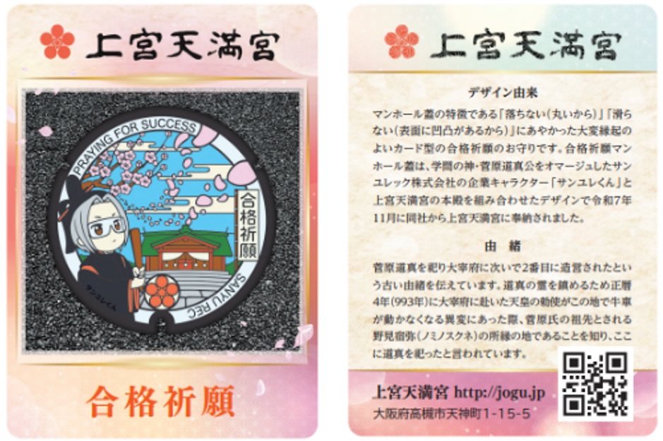 奉納されたマンホールふたは、学問の神様・菅原道真をオマージュしたサンユレック株式会社の企業キャラクター「サンユレくん」と上宮天満宮の本殿を組み合わせたデザインの鋳鉄製のふたで、サンユレック株式会社が、同社が取り組むSDGsの観点から学校や資格試験の合格を目指す若者を幅広く応援したいという想いを込めて作製されたものです。