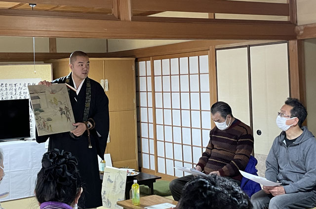 今回の交流会は、住職による高槻の歴史・講話と、ヘルマンハープの演奏会の二本立て。お話のテーマは「山岳寺院と日想観(にっそうかん/じっそうかん)」でした。