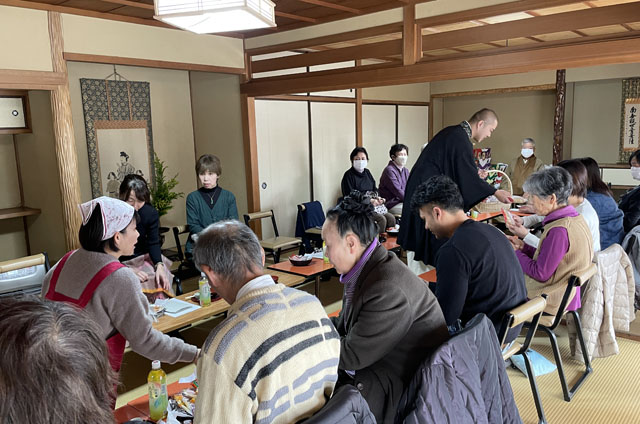 講話後は、参加者の方々にぜんざいがふるまわれ、小腹も満たされほっこりなごやかになる中、交流会は後半、ヘルマンハープの演奏会へと続きます。